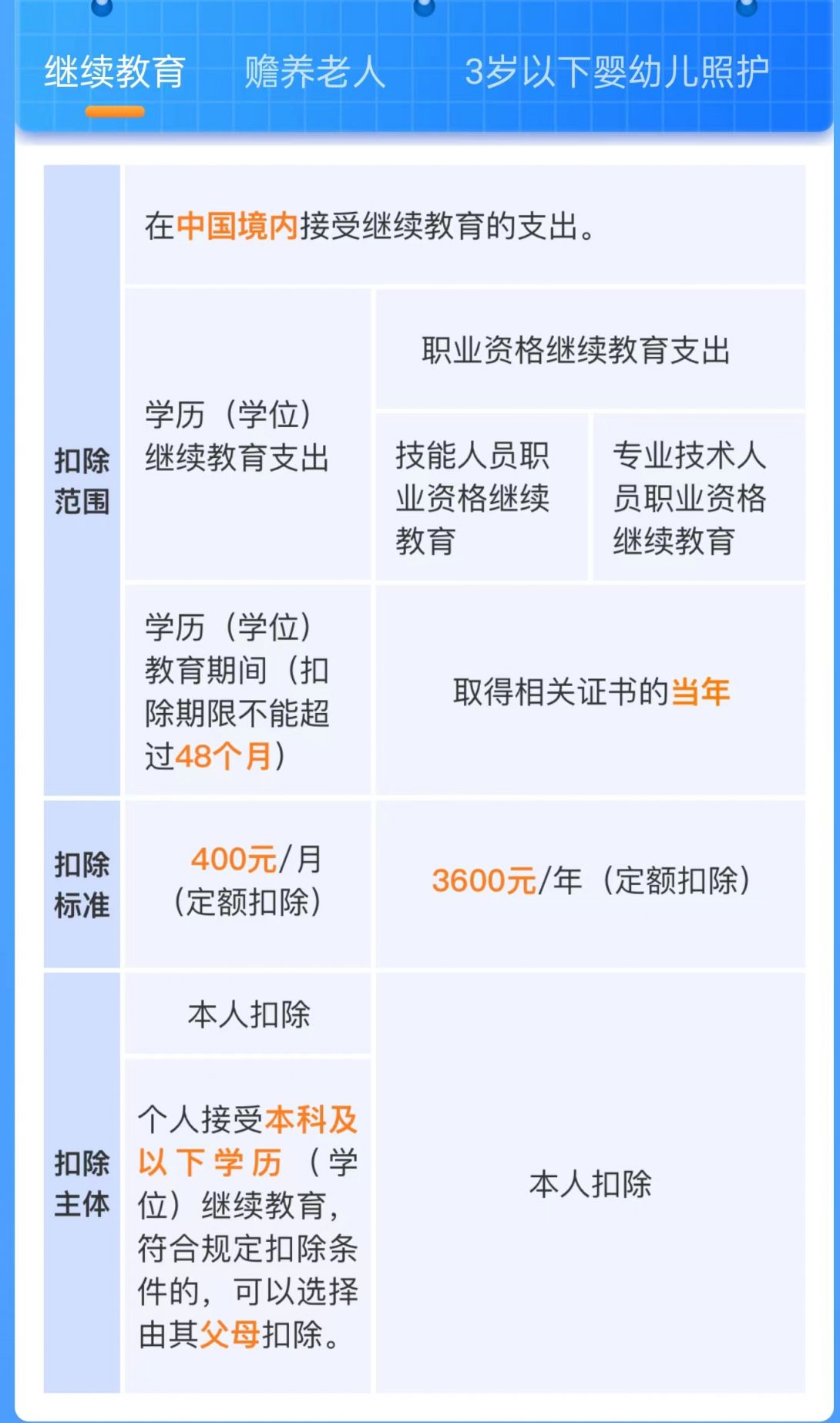 纳税人在中国境内接受学历(学位)继续教育的支出,在学历(学位)教育期间按照每月400元定额扣除。同一学历继续教育的扣除期限不能超过48个月。纳税人接受技能人员职业资格继续教育、专业技术人员职业资格继续教育支出,在取得相关证书的当年,按照3600元定额扣除。