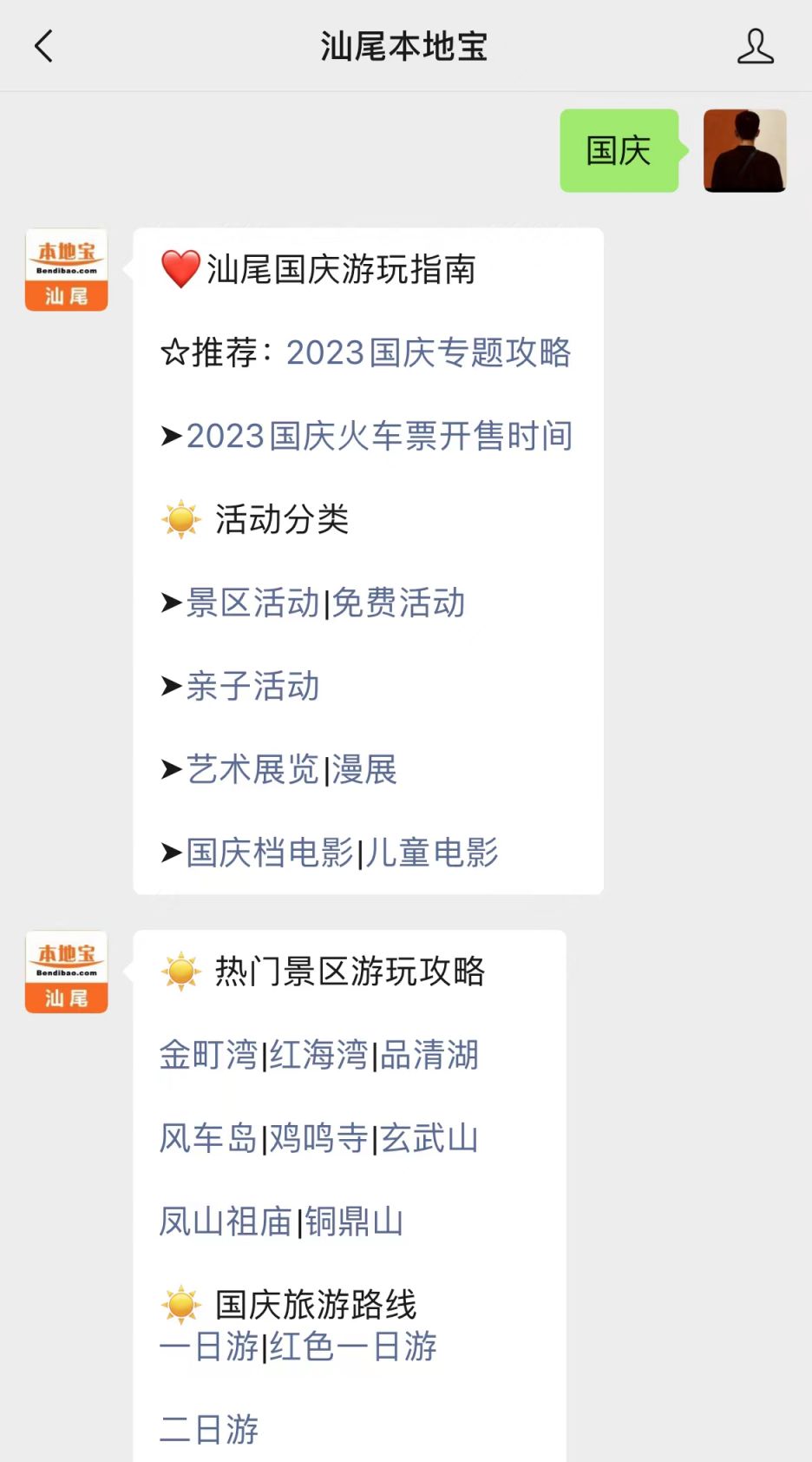 温馨提示:搜索微信公众号【汕尾本地宝】,关注后在对话框回复【国庆】获取汕尾国庆节日活动盘点(音乐节、漫展等)、优惠购票/预约入口、出行游玩攻略推荐等