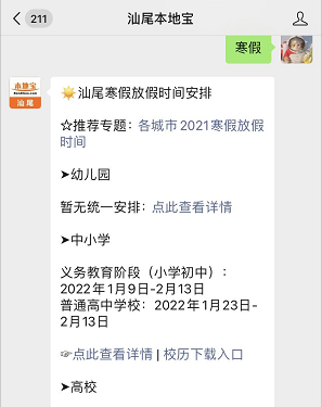 温馨提示:微信搜索公众号汕尾本地宝,关注后在对话框回复【寒假】可获取汕尾幼儿园 中小学 高校寒假放假时间及校历等。