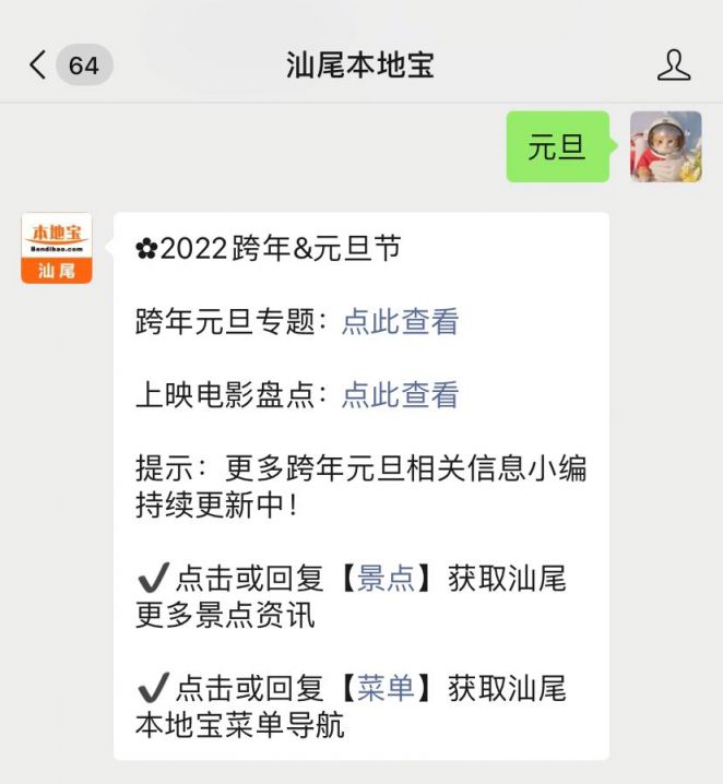 温馨提示:微信搜索公众号汕尾本地宝,关注后在对话框回复【元旦】可获取2022元旦节&跨年最新活动资讯、跨年&元旦专题、元旦档电影等。