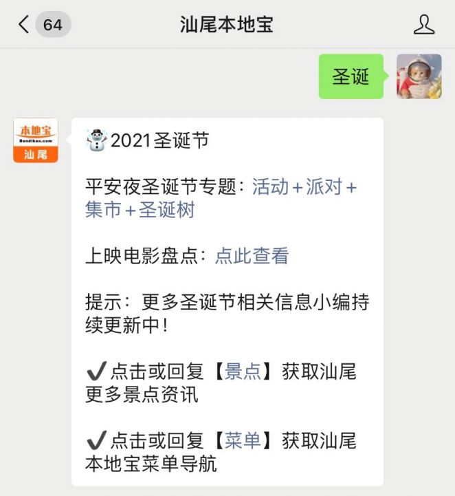 温馨提示:微信搜索公众号汕尾本地宝,关注后在对话框回复【圣诞】可获取圣诞节最新活动资讯、圣诞节专题、圣诞节上映电影等。