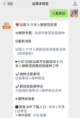 温馨提示:微信搜索公众号汕尾本地宝,关注后在对话框回复【儿童新冠】可获取汕尾3-11岁人群新冠疫苗最新消息 注意事项及接种禁忌 接种点等。